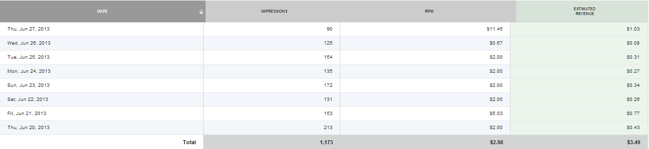 As per the above screenshot you can see that the impressions are infact lesser than 150 but still the revenue is consistent and if you see the below screenshot the account is just a week old. Still Media.net is able to extract  for me a considerable amount $3.49 despite such a low number of impressions per day.
